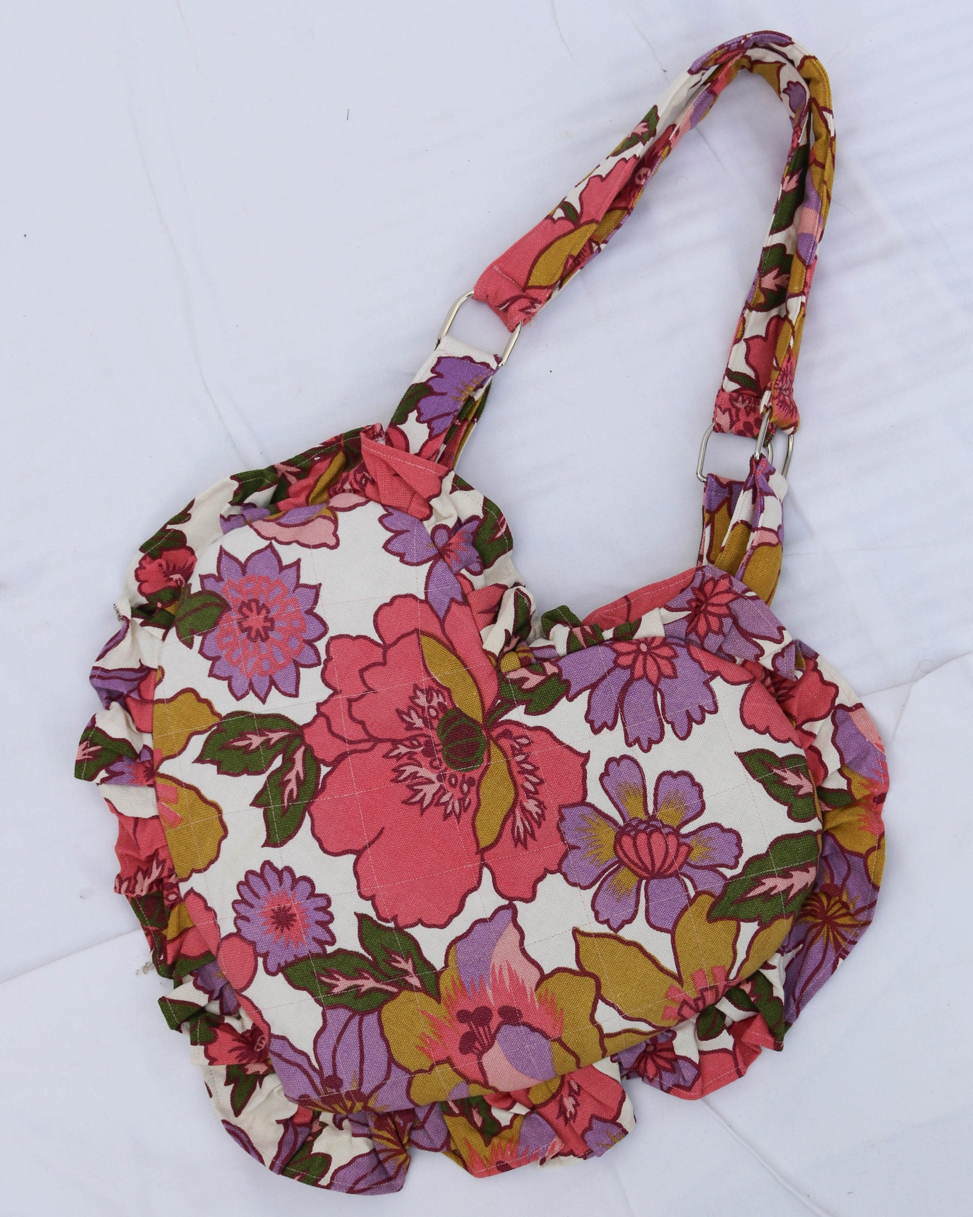Retro floral heart shaped tote bag. Made from a discarded vintage curtain, we have rescued another delightful vintage print from landfill.