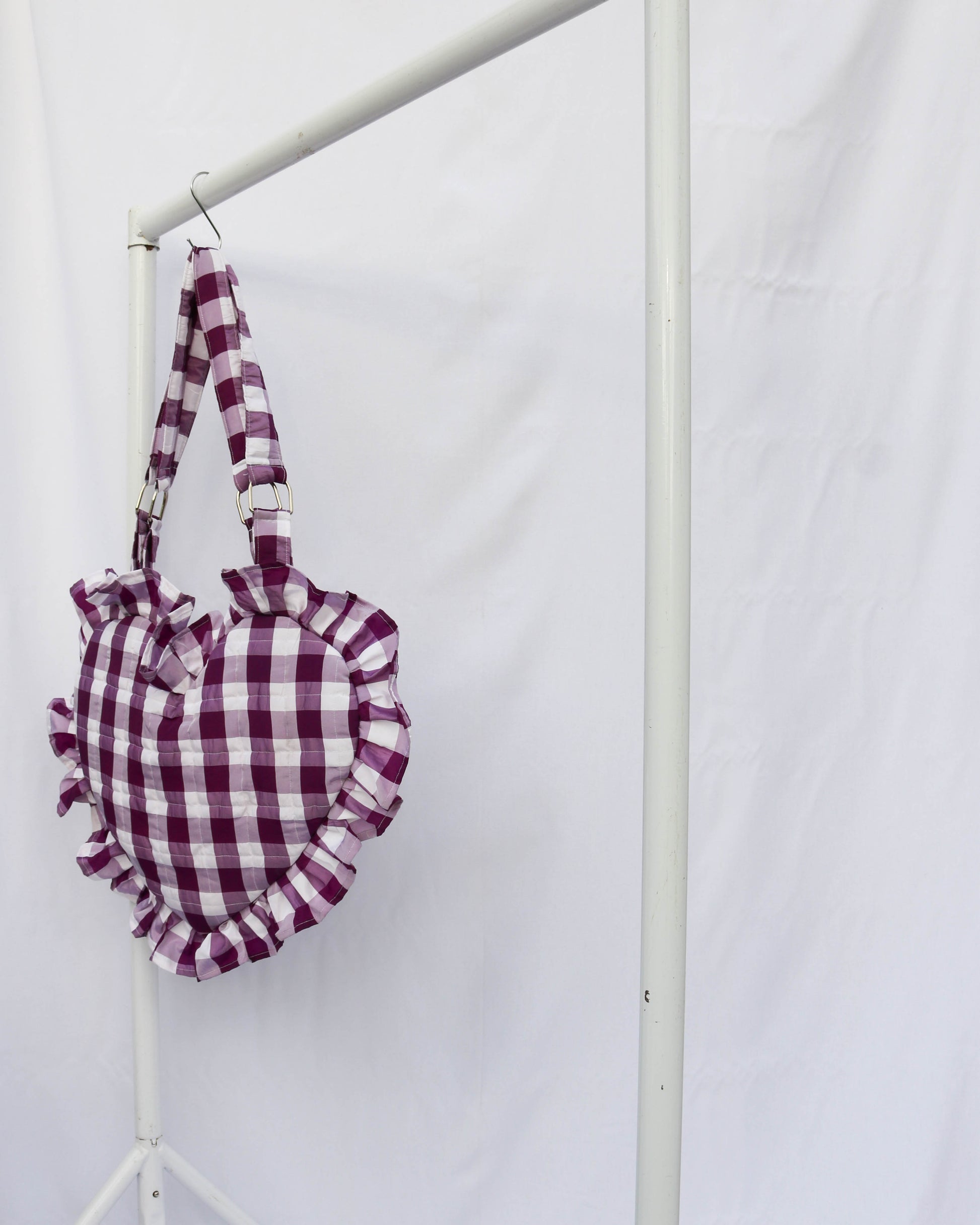 Purple gingham check heart shaped tote bag. Beautiful ruffle trim and gingham design is right on trend and will brighten up any outfit. Quilted and padded to hold shape for a statement shape. Also available in blue and pink.