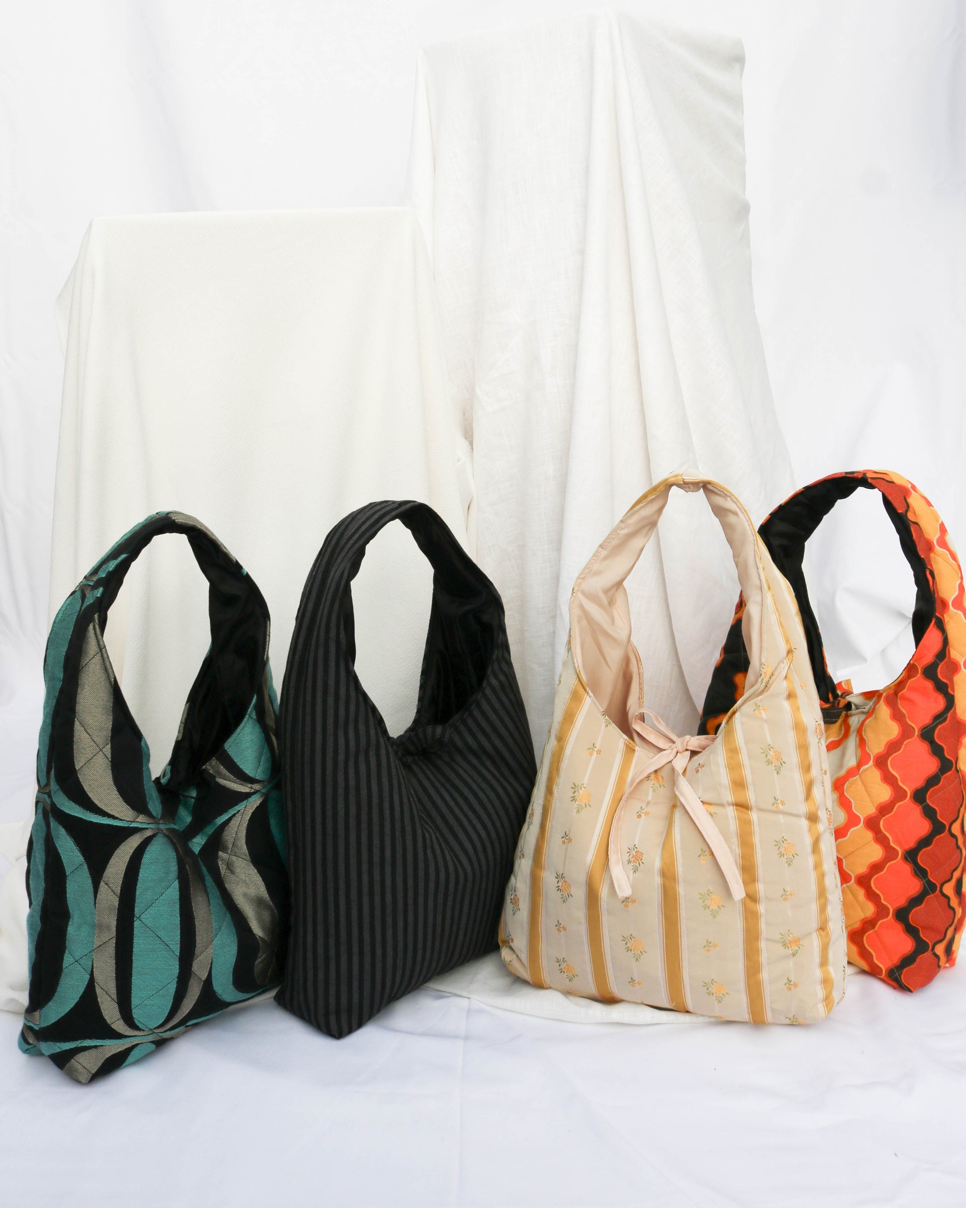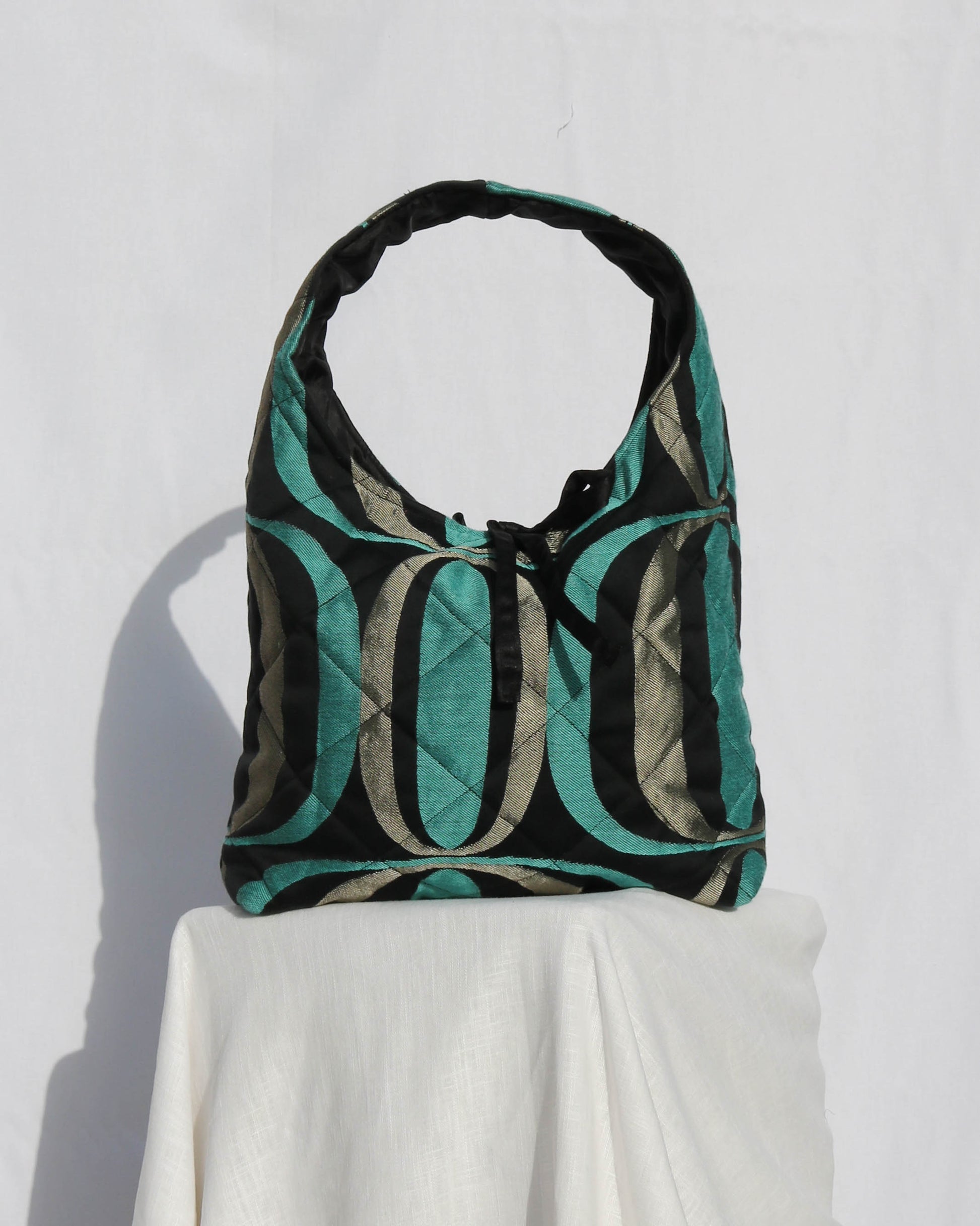 Geometric shaped jacquard handbag with bow closure. Made from second hand fabric off cuts and is one-of-a-kind. The perfect going out bag.